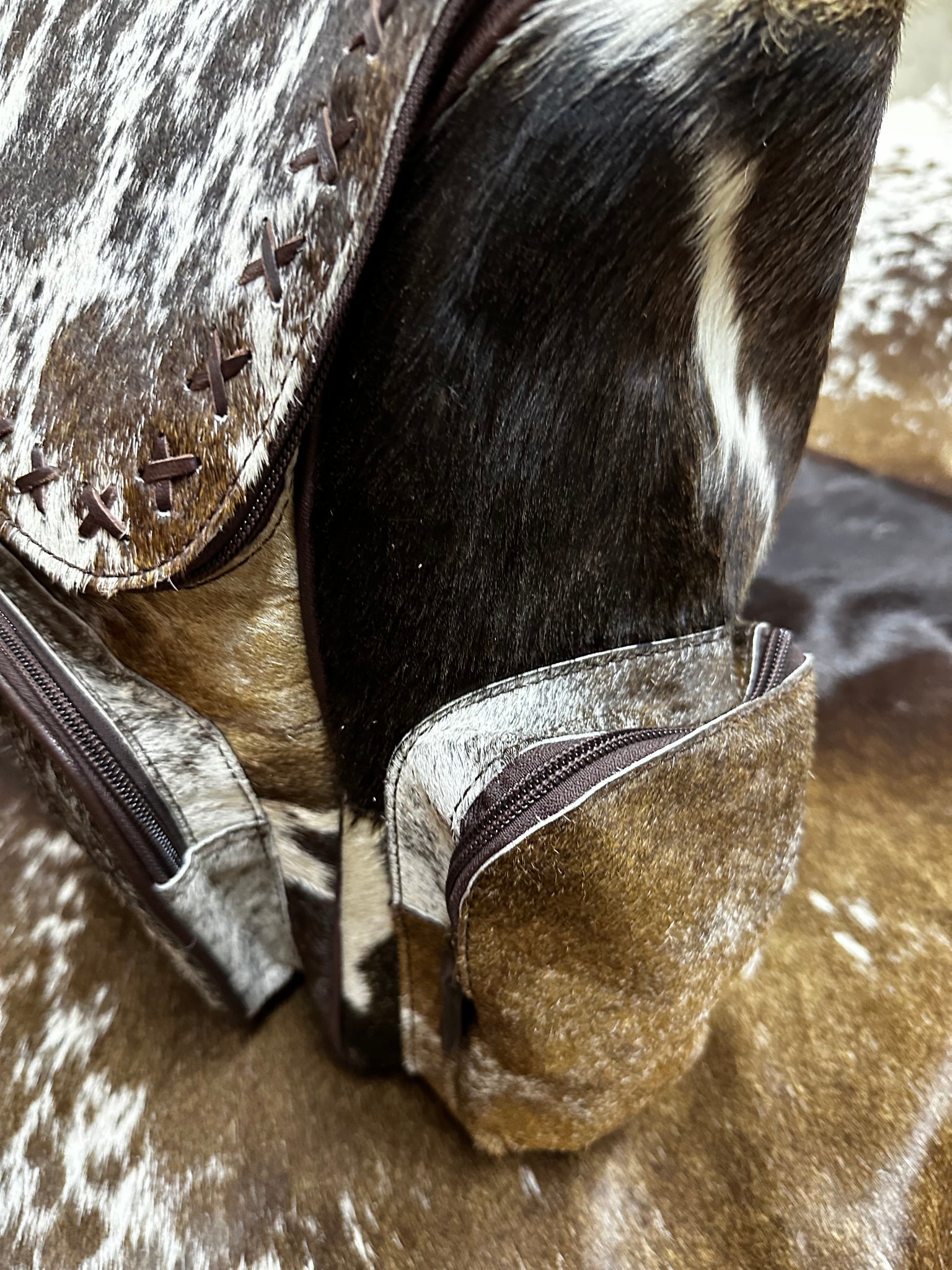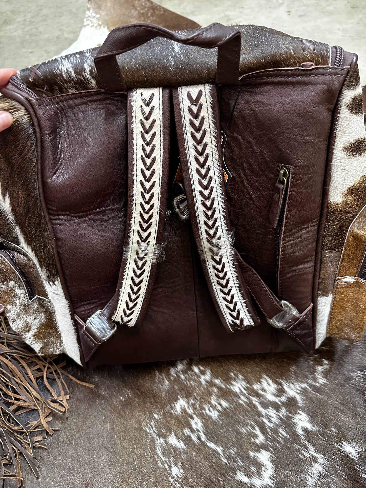 This Hide Backpack features high-quality hide and leather detailing, making it a versatile accessory for everyday use. Its stylish design is suitable for various occasions, such as work, travel, and school.